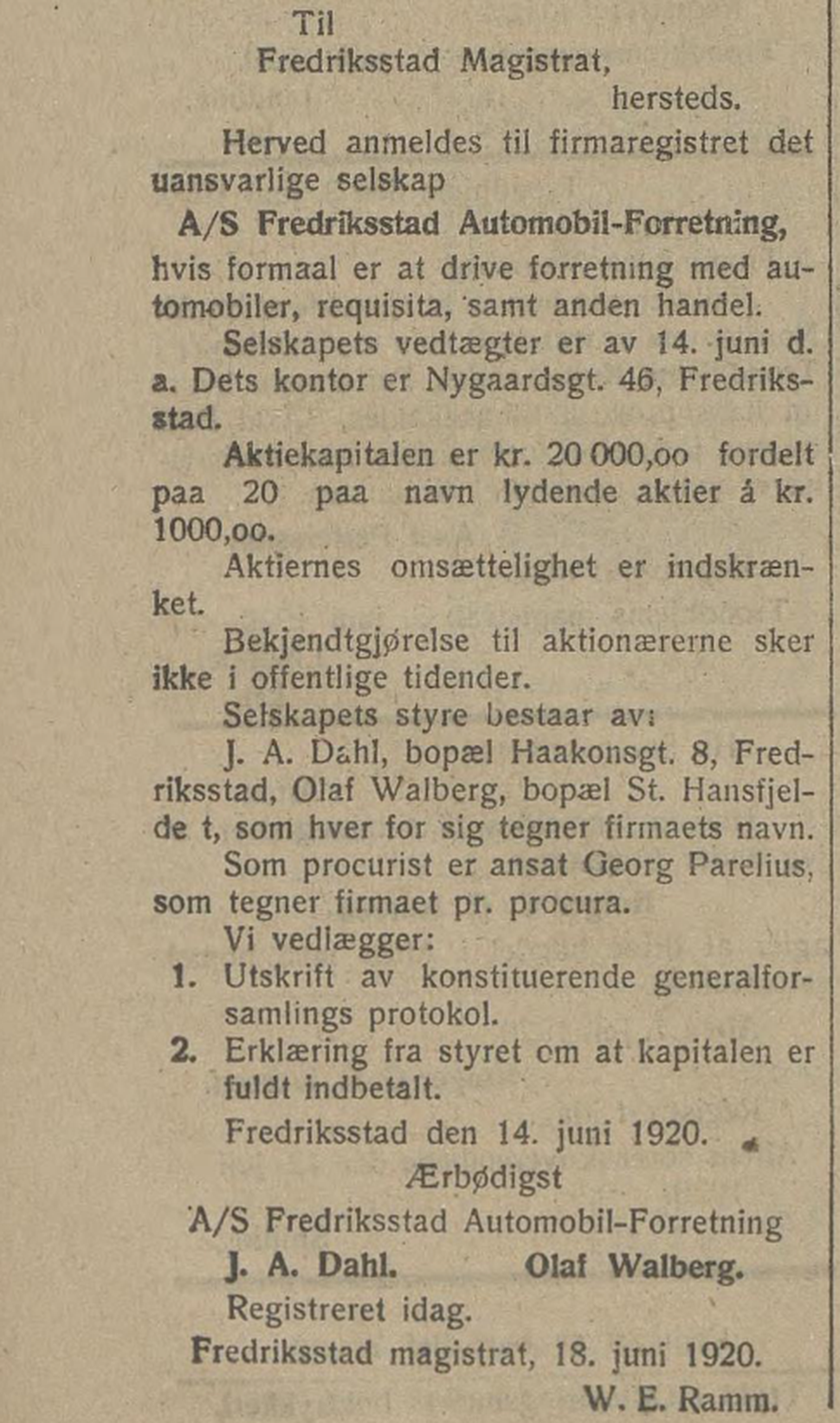 Offentlig registrering av A/S Fredrikstad Automobil-Forretning, 14. juni 1920.